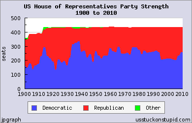 Years 1900 to 2010Year Democrats Republicans Other 1900 163 185 9 1901 151 197 9 1902 151 197 9 1903 178 208 0 1904 178 208 0 1905 136 250 0 1906 136 250 0 1907 164 222 0 1908 164 222 0 1909 172 219 0 1910 172 219 0 1911 228 161 1 1912 228 161 1 1913 291 127 17 1914 291 127 17 1915 230 196 9 1916 230 196 9 1917 216 210 6 1918 216 210 6 1919 190 240 3 1920 190 240 3 1921 131 301 1 1922 131 301 1 1923 205 225 5 1924 205 225 5 1925 183 247 4 1926 183 247 4 1927 195 237 3 1928 195 237 3 1929 164 270 1 1930 164 270 1 1931 217 217 1 1932 221 213 1 1933 313 117 5 1934 312 112 11 1935 322 103 10 1936 322 103 10 1937 334 88 13 1938 334 88 13 1939 262 169 4 1940 262 169 4 1941 268 162 5 1942 268 162 5 1943 218 208 4 1944 218 208 4 1945 242 190 2 1946 242 190 2 1947 188 245 1 1948 188 245 1 1949 263 171 1 1950 263 171 1 1951 234 199 1 1952 234 199 1 1953 211 221 1 1954 211 221 1 1955 232 203 0 1956 232 203 0 1957 233 200 0 1958 233 200 0 1959 283 153 0 1960 283 153 0 1961 263 174 0 1962 263 174 0 1963 258 177 0 1964 258 177 0 1965 295 140 0 1966 295 140 0 1967 247 187 0 1968 247 187 0 1969 245 189 0 1970 245 189 0 1971 254 180 0 1972 254 180 0 1973 239 192 1 1974 239 192 1 1975 291 144 0 1976 291 144 0 1977 292 143 0 1978 292 143 0 1979 276 157 0 1980 276 157 0 1981 243 192 0 1982 243 192 0 1983 269 165 0 1984 269 165 0 1985 252 182 0 1986 252 182 0 1987 258 177 0 1988 258 177 0 1989 259 174 0 1990 259 174 0 1991 267 167 1 1992 267 167 1 1993 258 176 1 1994 258 176 1 1995 204 230 0 1996 204 230 0 1997 207 227 0 1998 207 227 0 1999 212 222 1 2000 212 222 1 2001 212 221 2 2002 212 221 2 2003 204 229 0 2004 204 229 0 2005 202 232 0 2006 202 232 0 2007 233 202 0 2008 233 202 0 2009 257 178 0 2010 257 178 0